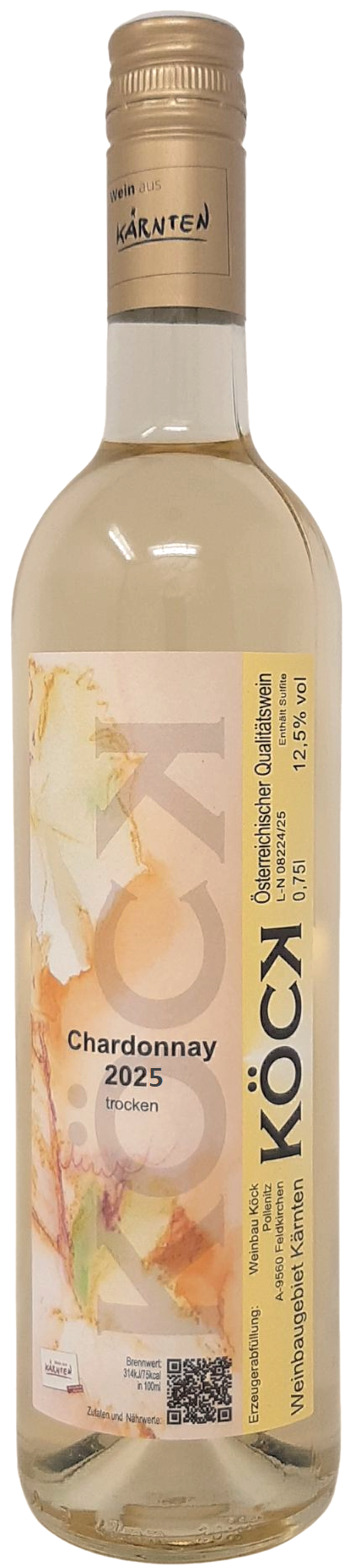 Chardonnay 2025 , trocken 12,9 % vol. Alk. 6,6 g/l Säure 3,7 g/l Restzucker Kärntens Hauptsorte von der Pollenitz