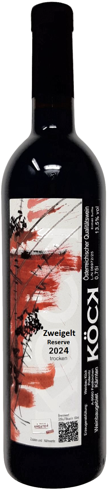 Zweigelt Reserve 2023 trocken 13,4%Vol Alk., 4,4g/l Säure, 1,3g/l Restzucker Preis pro 0,75l Flasche ab Hof .......... auf Anfrage Detail zum Wein